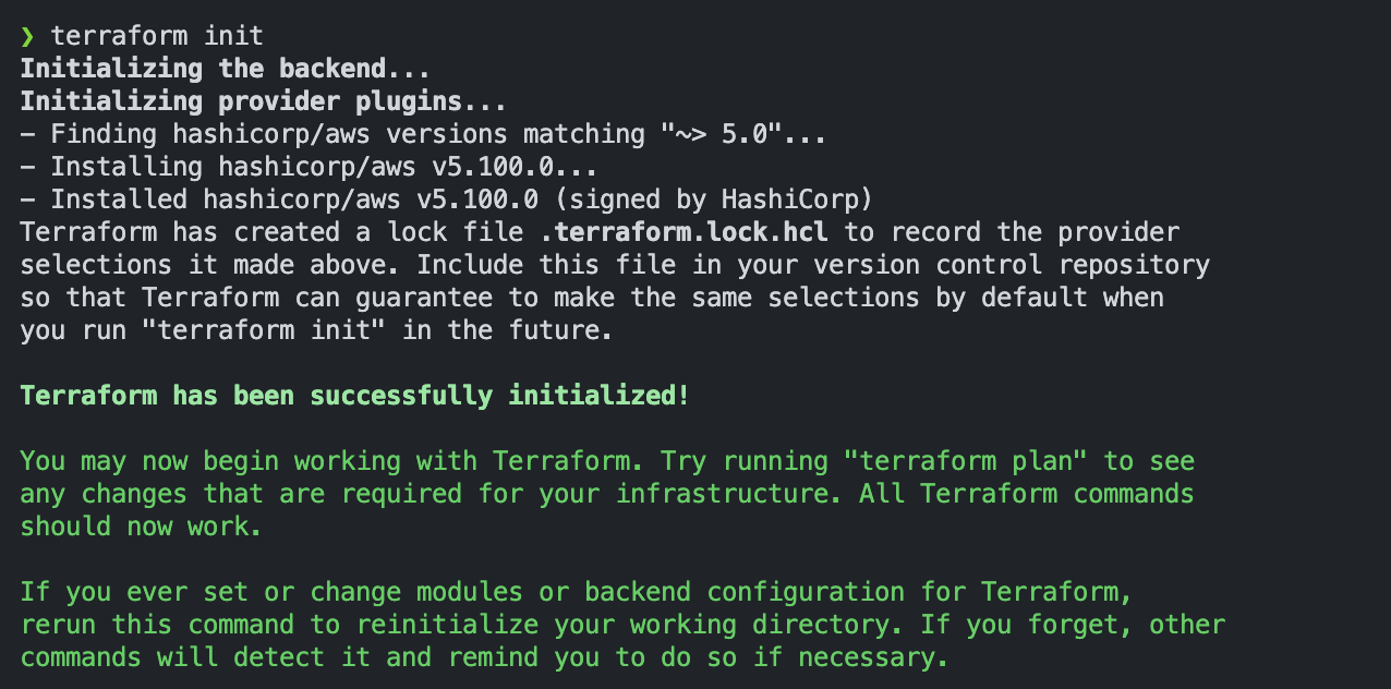 AWS 자격증명은 aws configure로 미리 설정해두었기 때문에 별도 작업 없이 바로 초기화를 진행했다.