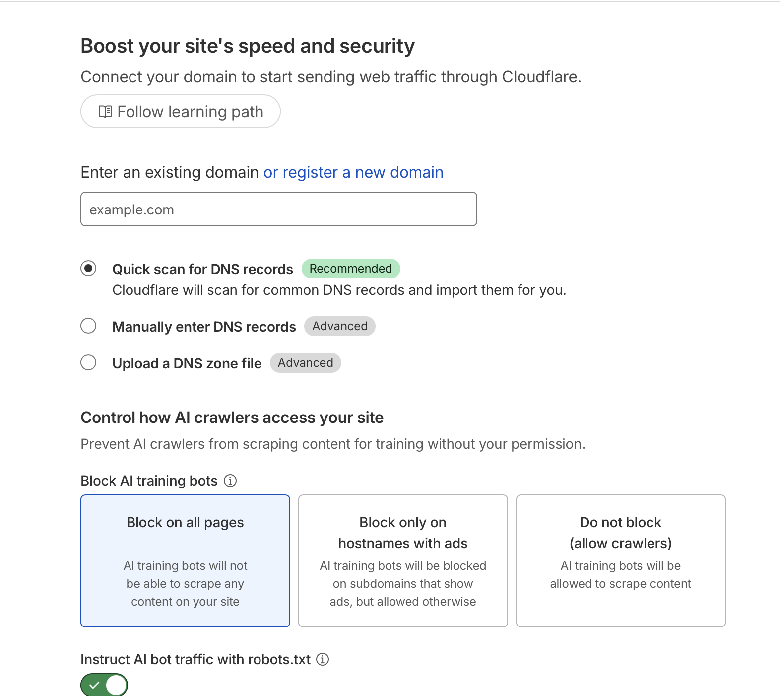 ์ฐ์ Enter an existing domain ์นธ์ ๋์ ๋๋ฉ์ธ์ ์ ๋ ฅํด์ค๋ค. ๋๋ Quick scan for DNS records ์ํ๋ก continue ๋ฒํผ์ ๋๋ ๋ค.