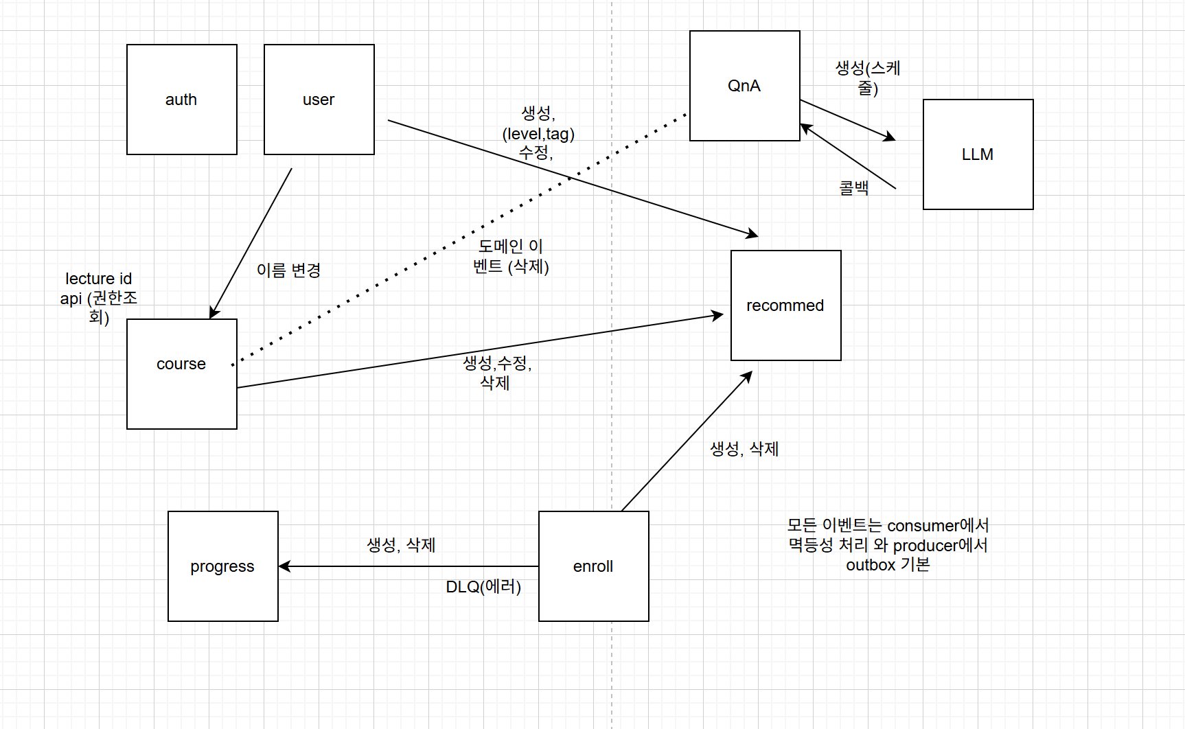 LLM 서버와 가장 큰 연관이 있는 도메인은 QnA이다. 그래서 해당 도메인에 대해 간단하게 짚고 넘어가려 한다. QnA는 도메인 이름으로 유추할 수 있듯이 강의를 들으면서 궁금한 점이 생기거나 문제가 생긴 것에 대해 강사에게 질문 및 답변을 받을 수 있는 기능이다. 이 도메인에 LLM을 붙인다는 것은 강사에게 들어온 질문에 AI로 답변을 해주도록 하는 기능이었다. QnA 도메인은 새 질문이 등록되면 RabbitMQ로 이벤트를 발행한다.